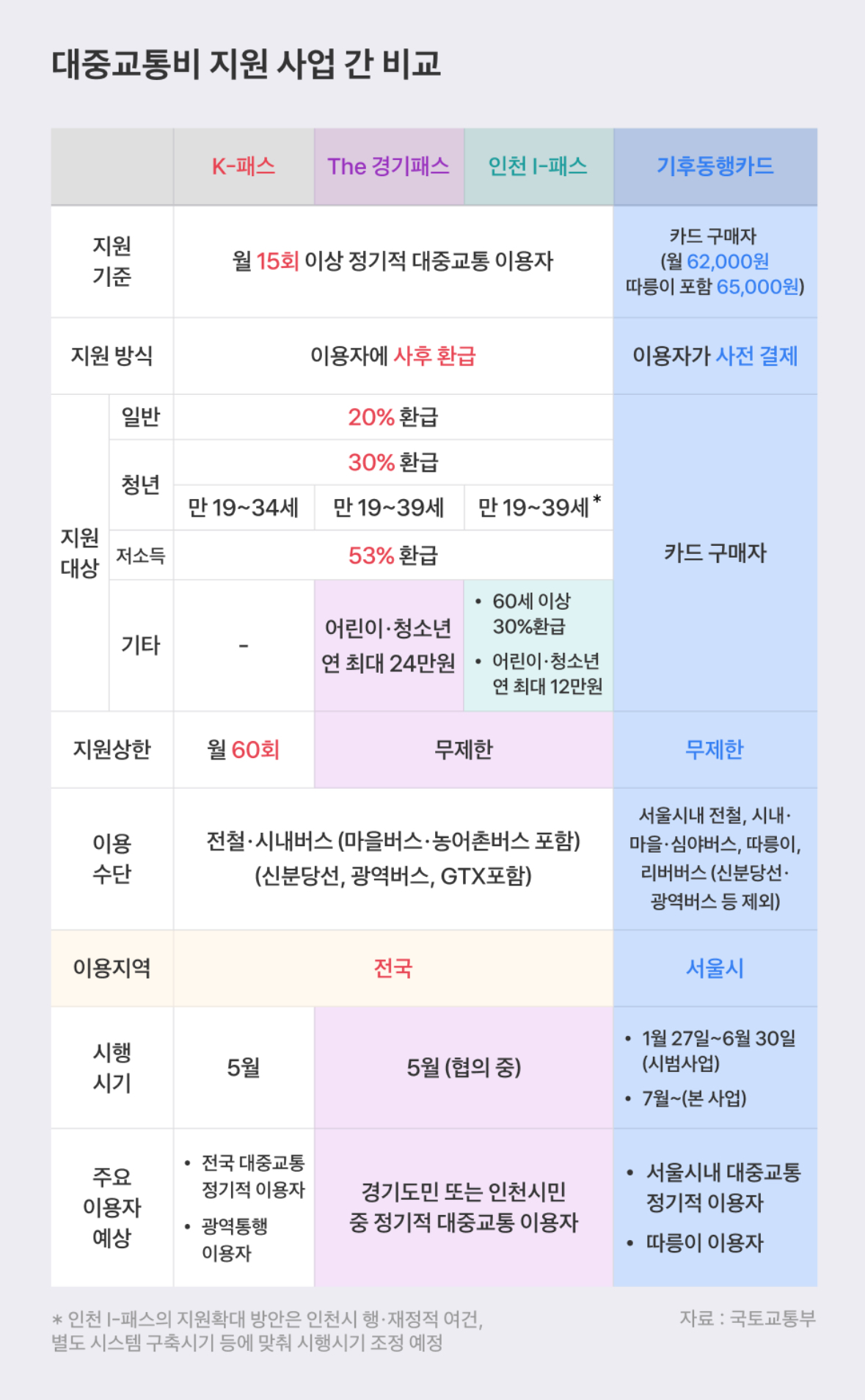 서울시 무제한 교통카드인 '기후동행카드'가 출시된 가운데, k패스, 경기패스, 인천패스가 5월에 이어 출시할 예정입니다.